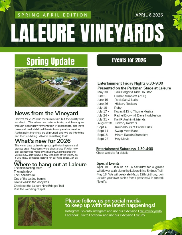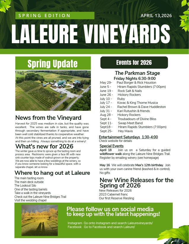 Laleure Vineyards started growing grapes in Parkman, Ohio in 1997. We became an official Ohio winery in 2002, and opened our tasting room doors in November of 2003. We are a small boutique winery dedicated to producing high quality wines made primarily from vinifera grapes grown on the property.